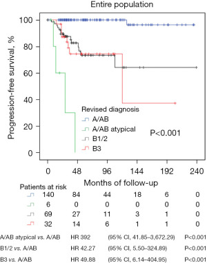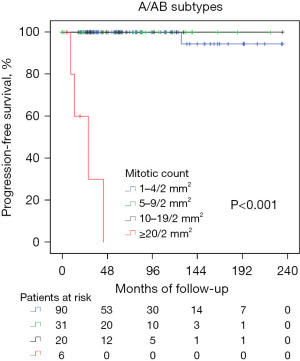 Prognostic factors within the A/AB subgroup were analyzed to identify patients with poor characteristics, as shown in Table 3. Multivariate Cox proportional hazard models demonstrated that mitotic count was the only independent prognostic factor as continuous variable [hazard ratio (HR) 1.15, 95% confidence interval (CI): 1.07–1.24, P<0.001]. A/AB cases were classified by mitotic count in 4 groups (1–4, 5–9, 10–19 and ≥20 mitotic figures per 2 mm2). As shown in Figure 3, patients with mitotic count 1–4, 5–9 and 10–19 had similarly favorable PFS, while those with ≥20 mitotic figures per 2 mm2 had remarkably worse outcome. Therefore, A/AB patients were classified as typical if mitotic count was 0–19/2 mm2 and atypical if ≥20 mitotic figures per 2 mm2. PFS curves of patients with typical A/AB, atypical A/AB, B1/2, B3 and rare subtypes are shown in Figure 4.