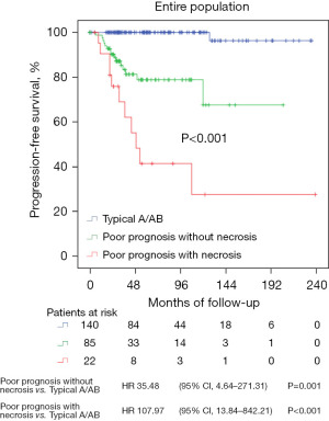 • When thymomas were divided into 3 prognostic groups, i.e., a favorable prognosis group (typical A/AB), an intermediate prognostic group (poor prognostic subtypes without necrosis) and a poor prognostic group (poor prognostic subtypes with necrosis), this model was prognostically important in AJCC or Masaoka stage I–II).