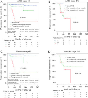 Multivariate Cox proportional hazard models were performed in the entire population, including the new subtype classification, as shown in Table 4. The strongest prognostic factors were the new subtype classification, the presence of necrosis, the status of surgical margins and neoadjuvant treatment. For simplicity, the thymoma subtypes were classified into favorable prognosis (typical A/AB, unusual subtypes) and poor prognosis subtypes (atypical A/AB, B1/2, B3) and were combined with the presence or absence of necrosis in a prognostic model. Although necrosis was present at the same rate in the favorable prognosis (29/143 cases, 20.3%) and the poor prognosis subtypes (22/107, 20.6%, P=1.000), it was associated with shorter PFS only in the poor prognosis subtypes (P=0.003) and not in the favorable prognosis group (P=0.602). Therefore, the new prognostic classification included 3 groups, a favorable prognosis group (typical A/AB, rare subtypes), an intermediate prognostic group (poor prognostic subtypes without necrosis) and a poor prognostic group (poor prognostic subtypes with necrosis), as shown in the respective PFS curves in Figure 5. The proposed classification was prognostic only in early clinical stages (AJCC or Masaoka stage I–II, difference of PFS in each prognostic group was statistically significant (P<0.001, respectively) (Figure 6A,6B). In contrast, the model was not prognostically important in advanced AJCC or Masaoka stages (III–IV) (P=0.35 and P=0.23, respectively), probably because in these stages typical A/AB subtype are under-represented (Figure 6C,6D). Nevertheless, none of the patients with typical A/AB subtype in advanced stage resulted in progression.