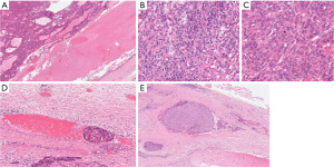 Thymomas were retrieved from the histopathology archives at St Thomas’s Hospital during the period from 1997 to 2017. Inclusion criteria for the study were a thymoma treated by resection for curative intent and availability of histologic slides. A total of 255 thymomas from 250 patients were collected and analyzed. Local institutional review board (IRB) ethical consent was not required for this study, but local hospital audit committee consent (Guy’s and St Thomas’ NHS Foundation Trust, REC reference 18/EE/0025) was obtained. The study conformed to the provisions of the Declaration of Helsinki and its subsequent amendments. Individual consent for this retrospective analysis was waived. Hematoxylin and eosin (H&E) stained sections from resected tumors were reviewed, and according to the 2021 World Health Organization classification of thymic tumors (1). In general, a resected tumor was sliced and submitted entirely if it was <3 cm, and submitted 1 section per cm if >3 cm. The number of tumor slides ranged 2 to 26, with a median of 7. Two senior histopathologists specialized in thoracic pathology reviewed all the cases individually, and when there were discrepancies in thymoma histotype and other features, the cases were reviewed with dual-head microscope for consensus. Mitotic count was evaluated by the same two histopathologists using dualhead microscope. A variety of clinical and histopathologic parameters were recorded and analyzed. The mitotic count in 2 mm2, that is, 8 high-power fields (×400) by NIKON Eclipse (10× eyepiece and 40× objective: 0.25 mm2), was evaluated in areas of highest mitotic density (hotspot) in type A and AB thymomas. In type AB thymomas, the mitotic count was evaluated in lymphocyte-poor areas, as it is difficult to distinguish between mitotic figures of the tumor cells and of the lymphocytes. The evaluation of vascular invasion followed the protocol routinely used for thyroid follicular neoplasms, i.e., a vessel within or beyond capsule that contains a tumor covered with endothelium, attached to the wall or with thrombus. Low-grade cellular atypia was defined as uniform nuclei in size and shape, while high-grade atypia was defined as enlarged nuclei of varied sizes and shapes, often accompanied by conspicuous nucleoli. Predominant pattern was assigned in each case. Microscopic photographs of examples of necrosis, cytologic atypia and vascular invasion are demonstrated in Figure 1.