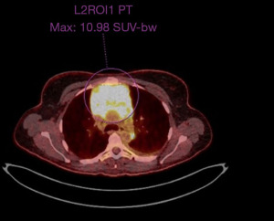 A thoracic computed tomography (CT) scan (Figure 2) revealed a large anterior-superior mediastinal mass of 80 mm × 67 mm with malignant left pleural effusion. The core biopsy was consistent with a myeloid sarcoma (MS), a rare extramedullary manifestation of acute myeloid leukemia (AML), according to World Health Organization (WHO) 2022 classification and the International Consensus Classification (ICC) 2022. The fluorine 18-labeled fluorodeoxyglucose (FDG) positron emission tomography (PET)-CT (Figure 3) showed increased FDG uptake by the mediastinal mass, the presence of numerous hypermetabolic lymph nodes on both sides of the diaphragm and a thickened left pleura. The bone marrow biopsy was negative for AML and a new large surgical biopsy of the mediastinal mass had to be performed for fresh tissue samples, in order to perform flow cytometry, molecular and cytogenetic analysis.