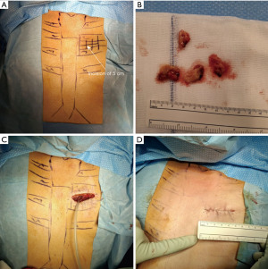 Surgeons proceeded with disinfection and draping once the patient was in state of well-being thanks to hypnosis. Local anesthesia was infiltrated through the cutaneous and subcutaneous planes and extended into the second intercostal space at the site of incision with 25 mL of lidocaïne 1% with adrenaline 1/200,000 was performed. Once the local anesthesia had taken effect, we made an incision of 5 cm at the level of the 2nd left intercostal space (Figure 4A, Video 1). This step was followed by dissection between the fibers of the pectoral muscle then by incision of the intercostal space. This allowed clear visualization of the waxy white tumor. We performed four cold blade biopsies in a square of 1 cm × 1 cm × 1 cm with a scalpel (Figure 4B). The biopsies were followed by careful hemostasis. During the procedure the pleural space was opened, and the resulting pneumothorax was evacuated only by aspiration before definitive skin closure (Figure 4C,4D). The surgery lasted 28 minutes.