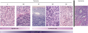 Following tissue sampling, subtyping per WHO classification is critical. Thymomas are categorized as A, AB, B1, B2, or B3 (Figure 1), based on epithelial cell morphology and lymphocyte proportions (13). TC is a separate, more aggressive subtype, spanning well-differentiated to poorly-differentiated categories (1,14-17).