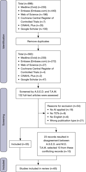 The Preferred Reporting Items for Systematic Reviews and meta-analysis (PRISMA) flow diagram (Figure 3) illustrates the systematic search for studies on the use of TETs and AI for diagnosis and prognosis. The initial search yielded 998 records across the six databases mentioned above. After removing 416 duplicates, 582 unique records were screened by A.S.E.D. and M.D. A total of 132 full-text articles were assessed. According to the eligibility criteria, 54 studies were excluded, and 23 records resulted in disagreement between A.S.E.D. and M.D. T.A.M. selected 10 from these conflicting records. As a result, a total of 65 studies were selected for the final analysis.