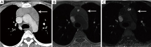 Dual-energy computed tomography (DECT) has also been evaluated to define a role in the differentiation of prevascular masses. Malignant tumors reveal higher iodine concentrations (IC) as compared to benign tumors (58). In a study of 37 patients, Chang et al. found that iodine related Hounsfield units (IHU) and IC could be helpful to differentiate low-risk thymomas, high-risk thymomas, and thymic carcinomas. Lower values were noted in higher grade tumors, presumably due to the presence of necrosis. They concluded that DECT, using iodine concentration measurement derived quantitative analysis, could aid in the ability to differentiate between low-risk thymoma, high-risk thymoma, and thymic carcinoma (59).