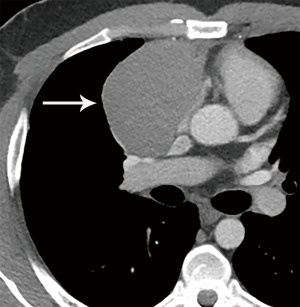 Congenital thymic cysts can occur anywhere along the course of the thymic descent, but most often occur in the prevascular mediastinal space (26). Congenital thymic cysts arise from remnants of the thyropharyngeal duct. Acquired thymic cysts are more common, often multi-locular and complex, associated with neoplasm (such as thymoma, lymphoma, or germ cell tumors), radiation therapy, aplastic anemia, systemic lupus erythematosus, myasthenia gravis, Sjogren syndrome, after tumor resection, an in the setting of acquired immune deficiency syndrome (AIDS) in children (26,27). In general, thymic cysts present as well circumscribed round or oval lesions in the prevascular space with fluid density Hounsfield units (HU) less than 20. They most commonly have no wall thickening, irregularity, or enhancement. If CT findings are indeterminant, MRI can be used for further evaluation. On MRI, simple thymic cysts demonstrate increased T2 signal, variable T1 signal depending on protein content, and no wall nodularity or enhancement (Figure 4).