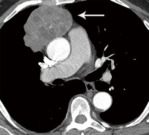 Thymic epithelial tumors include thymoma, thymic neuroendocrine tumor (carcinoid), and thymic carcinoma. These tumors are predominantly seen in the prevascular mediastinum with a myriad of imaging findings. Thymic epithelial tumors can be homogeneous or heterogeneous, solid or cystic, and have well-circumscribed or irregular borders. There is unfortunately significant imaging overlap between various World Health Organization (WHO) types of thymoma as well as between thymoma and thymic carcinoma. There are, however, clinical and imaging patterns that help in differentiation, but the differentiation usually requires histological proof. Malignant thymic tumors have a median age at presentation in the sixth decade. More benign tumors have a median age at presentation in the fourth to fifth decades (34-36). The more aggressive thymomas and malignant tumors are more likely to have clinical symptoms such as pain or shortness of breath (36). Benign tumors are more likely to have intralesional fat, be midline, and retain normal thymic shape. Malignant tumors are more likely to be larger and locally invasive (37-39). Common imaging findings and techniques utilized to more accurately differentiate various thymic tumors will now be reviewed.