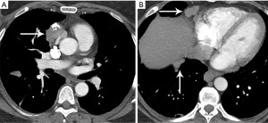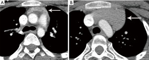 Thymic carcinoma and thymic neuroendocrine tumors have similar imaging characteristics which may often overlap with the more aggressive histologies of thymoma, such as B3 thymoma. Thymic carcinomas and neuroendocrine tumors commonly present as large prevascular masses with irregular or poorly marginated borders, areas of necrosis or cystic change, and hemorrhage. Compared with thymomas, there is a greater incidence of local invasion (1) (Figures 2,11). Pleural or pericardial nodules, pleural effusion, and distant metastasis are more commonly seen with thymic carcinoma or thymic neuroendocrine tumor than thymoma (Figure 12). More aggressive thymic epithelial tumors can invade or compress the SVC resulting in SVC syndrome. This is a clinical syndrome marked by swelling of the neck, face, and upper extremities, with associated cough, headache, and shortness of breath. Pleural metastatic disease, which is more common in thymic carcinoma and thymic neuroendocrine carcinoma, generally consists of small enhancing pleural nodules or areas of enhancing pleural thickening. These are generally adequately assessed with thin-slice contrast-enhanced CT, although, contrast-enhanced MRI and PET/CT can be of additional benefit in questionable cases.