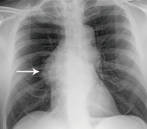 The most performed imaging examination is the routine chest radiograph which can be the first modality suggesting a thymic lesion. Thymic tumors may result in added soft tissue projecting over normal anatomic structures resulting in thickening of the anterior junction line or the “silhouette sign”. Normally air in the lungs delineates the soft tissue structures that abut the lung, such as the heart and mediastinum. Clear delineation of anatomic structures can be limited when a mass is present as soft tissue now abuts normal structure instead of air. This inability to distinguish one structure from another results in obscuration, or the “silhouette sign”. Lateral radiographs help confirm the presence of thymic tumors as they better demonstrate the prevascular space which is readily seen behind the sternum and is normally lucent. A mass in the prevascular space can form a convex contour abnormality when outlined by adjacent lung (Figure 1). Small prevascular lesions may not be radiographically apparent, however. Given the low sensitivity and specificity of radiographs, cross-sectional imaging is essential in the assessment of thymic tumors.