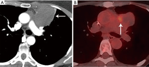 The role of FDG PET/CT in thymoma imaging is limited. Given the presence of FDG uptake in the normal and hyperplastic thymus, especially in younger adults and children, false-positive results can occur. In fact, physiologic uptake has been reported in 28% of patients under 40 years of age and up to 73% in children less than 13 years of age (44). PET/CT has not been shown to differentiate different WHO histological classifications of thymic tumors, although the more aggressive histologies tend towards higher FDG uptake (45,46) (Figures 2,3). Indium111 octreotide nuclear medicine scans have now been replaced by 68Ga-labeled somatostatin analogues because 68Ga-labeled somatostatin analogues, such as 68Ga-DOTATATE, are used for PET/CT, and thus provide better resolution.