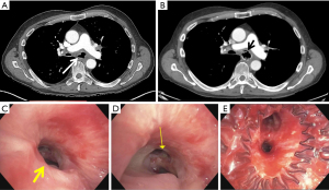Approximately 75% of acquired ADFs are iatrogenic and develop following esophagectomy or other mediastinal surgery, pressure necrosis from a cuffed endotracheal tube, trauma from endoscopy, airway or esophageal stent erosion, and antineoplastic treatments including chemoradiation and bevacizumab (3,7-10). While antineoplastic treatments have been associated with the development of an ADF, its direct correlation may be overestimated since oncologic treatments can prolong survival and therefore allow more time for a fistula to develop and become symptomatic. Balazs et al. found that 90% of patients who developed an ADF after radiotherapy did so greater than 1 month after treatment (6). Tuberculosis was previously a leading cause of benign fistulas, but incidence has waned over time. Other infections associated with ADFs include histoplasmosis, actinomycosis, and abscesses. Additional benign etiologies include inflammatory diseases like rheumatoid arthritis and inflammatory bowel disease, trauma, caustic ingestion, and broncholiths.