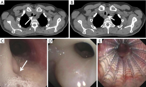 - Zacharias J, Genc O, Goldstraw P. Congenital tracheoesophageal fistulas presenting in adults: presentation of two cases and a synopsis of the literature. J Thorac Cardiovasc Surg 2004;128:316-8. [Crossref] [PubMed]