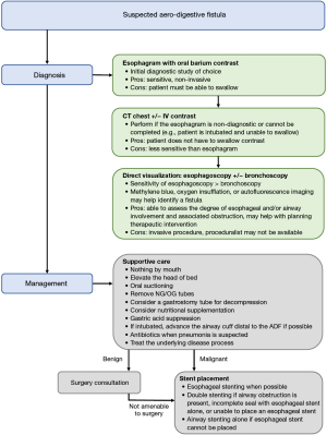 Early intervention is essential as a patient’s quality of life and survival can be significantly impacted by a patent fistula. Mortality is greatest for malignant ADFs with an estimated median survival of 4–8 weeks with medical management alone (4,24,25). However, this may be an underestimation in modern times as these data included patients treated over 30 years ago who were too ill to undergo available interventions of their respective times. The cause of death varies significantly between studies but most commonly include pneumonia with sepsis and respiratory failure (22–82%), malnutrition (1–44%), and hemorrhage (12–33%) (4,26,27). The management of ADFs depends on several factors including the patient’s symptoms and comorbidities, etiology, size and location of the fistula, and local expertise. The primary objective of invasive intervention is to prevent gastrointestinal content spillage into the airways which can cause aspiration pneumonia and sepsis. While the majority of patients will require invasive intervention, some with reversible etiologies like infection or inflammatory bowel disease have demonstrated spontaneous closure by treating the underlying condition (17).