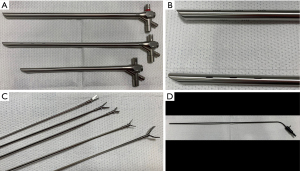 Figure 6 Rigid bronchoscope and associated tools: (A) Karl Storz rigid bronchoscope and tracheoscope illustrating varying lengths and barrel diameters; (B) side ports for ventilation during therapeutic bronchoscopy and silicone stent placement; (C) variety of rigid tools available for use during rigid bronchoscopy; (D) rigid electrocautery suction.