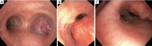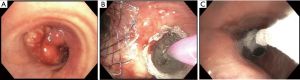 Figure 5 Multimodal management of MCAO: (A) metastatic head and neck squamous cell carcinoma causing significant obstruction of the left and right mainstem bronchi secondary to endobronchial tumor and extrinsic compression; (B) tumor debulking was followed by placement of fully covered stents in bilateral mainstem bronchi and balloon dilation; (C) spray cryotherapy was then applied with focus on residual carinal tumor. MCAO, malignant central airway obstruction.