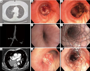 Figure 2 Types of airway obstruction pre- and post-intervention: (A) endoluminal tumor in the left mainstem bronchus seen on chest CT and (B) bronchoscopy; (C) the tumor was removed with an electrocautery snare and the tumor base was treated with APC; (D) significant LMS bronchus narrowing as seen on chest CT airway reconstruction; (E) extraluminal obstruction of the LMS as seen during bronchoscopy; (F) improvement in LMS bronchus diameter after endobronchial stent placement and balloon dilation; (G) right mainstem and bronchus intermedius narrowing as seen on chest CT; (H) obstruction secondary to endobronchial squamous cell carcinoma and extrinsic compression from the subcarinal lymphadenopathy and right lower lobe mass; (I) APC was used for coagulation and tumor ablation followed by balloon dilation and endobronchial stent placement. CT, computed tomography; APC, argon plasma coagulation; LMS, left mainstem.