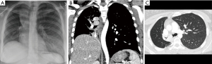 Figure 3 Chest X-ray (A), coronal (B) and axial chest CT (C) images from the same patient illustrating the additional detail gained with chest CT. CT, computed tomography.