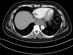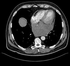 Patient 4 was a 53-year-old male presenting initially with fatigue, sore throat and fever. Later he developed chest pain, weight loss and night sweat. Chest CT revealed a 120 mm tumor on axial imaging, located posterior to the left atrium (Figure 4).