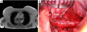 Briefly, she was a 70-year-old female, who has been suffering from increasing dyspnea for the last 6 months. Axial chest CT imaging showed a 90 mm subcarinal mass with compression of the tracheal carina and oesophagus. An EBUS-TBNA was performed. Cytopathological examination was compatible with a leiomyosarcoma. OGD showed extrinsic oesophageal compression without mucosal infiltration. Staging including FDG PET/CT could exclude distant metastases and a gynaecological evaluation could exclude an extramediastinal primary. Preoperative MRI is shown in Figure 3A.