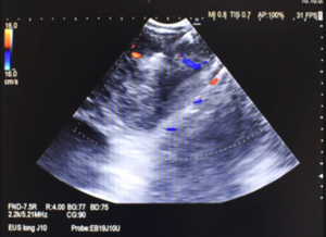 - Grade IV [bronchial artery (BA) inflow sign]: the blood flow from the BA toward the lymph node that was visualized as blue signals on EBUS color Doppler-mode image.